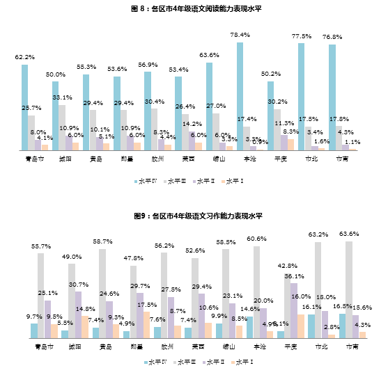 监测采用分层整群随机抽样,先将青岛市按照行政区划分为了10个抽样分样本,根据各区市的地理位置、城乡学生比例、教育经济发展状况、学校类型等因素在每个区市中随机抽取12所学校,每个学校抽取4年级(由于测试时间为2015年1月,实际测试目标群体已升入5年级,但测试内容仍为4年级所学内容)60名学生(不足60人按照实际人数)进行语文学业水平测试以及学生调查问卷的填答。本次调查问卷同时包括样本校的340名语文教师和120名校长。