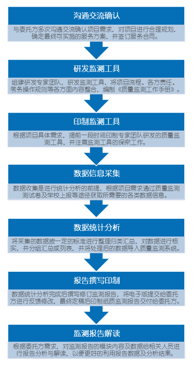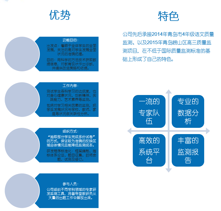 公司多次先后承接青岛市语文质量监测、崂山区高三质量监测项目以及六年级质量监测项目,在不低于国际质量监测标准的基础上形成了自己的特色。
